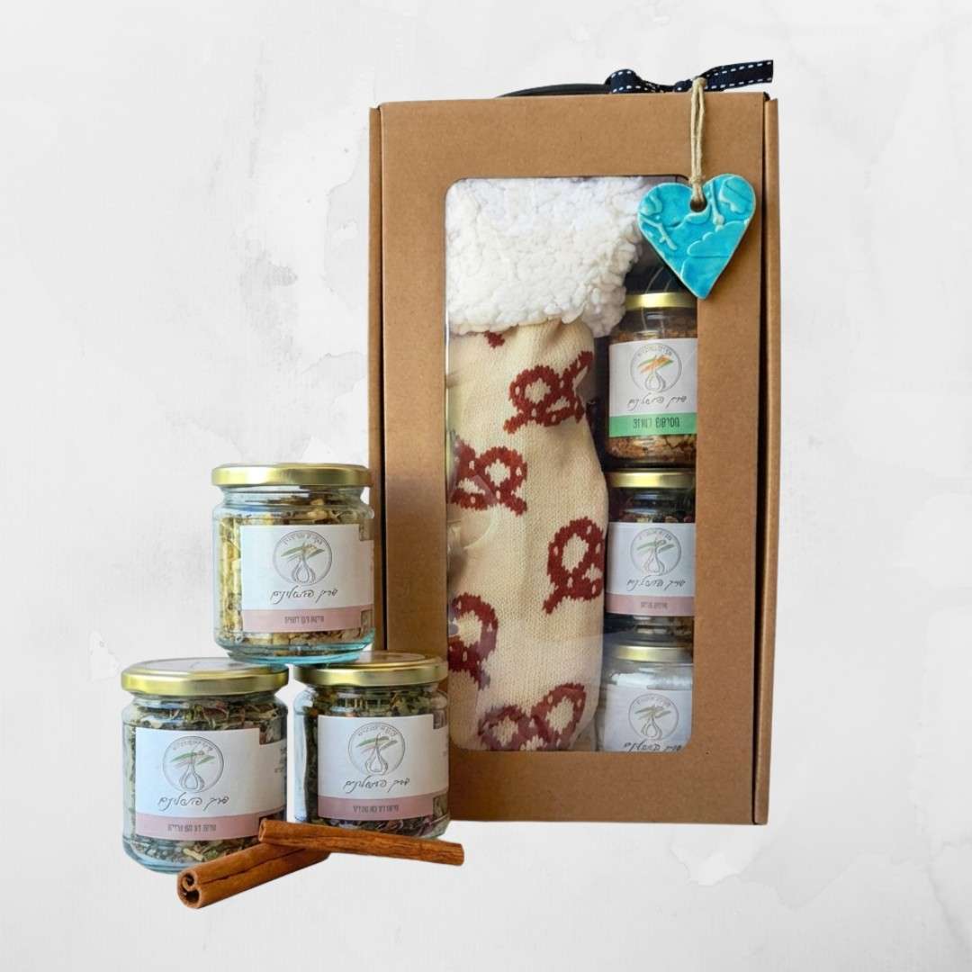 המארז כולל: גרב חורפית מפנקת ( לפי המלאי הקיים) 3 חליטות / סחלב (לפי הקיים במלאי) לב קרמיקה שהוכן בשיתוף עם החניכים ארוז בקרטון
