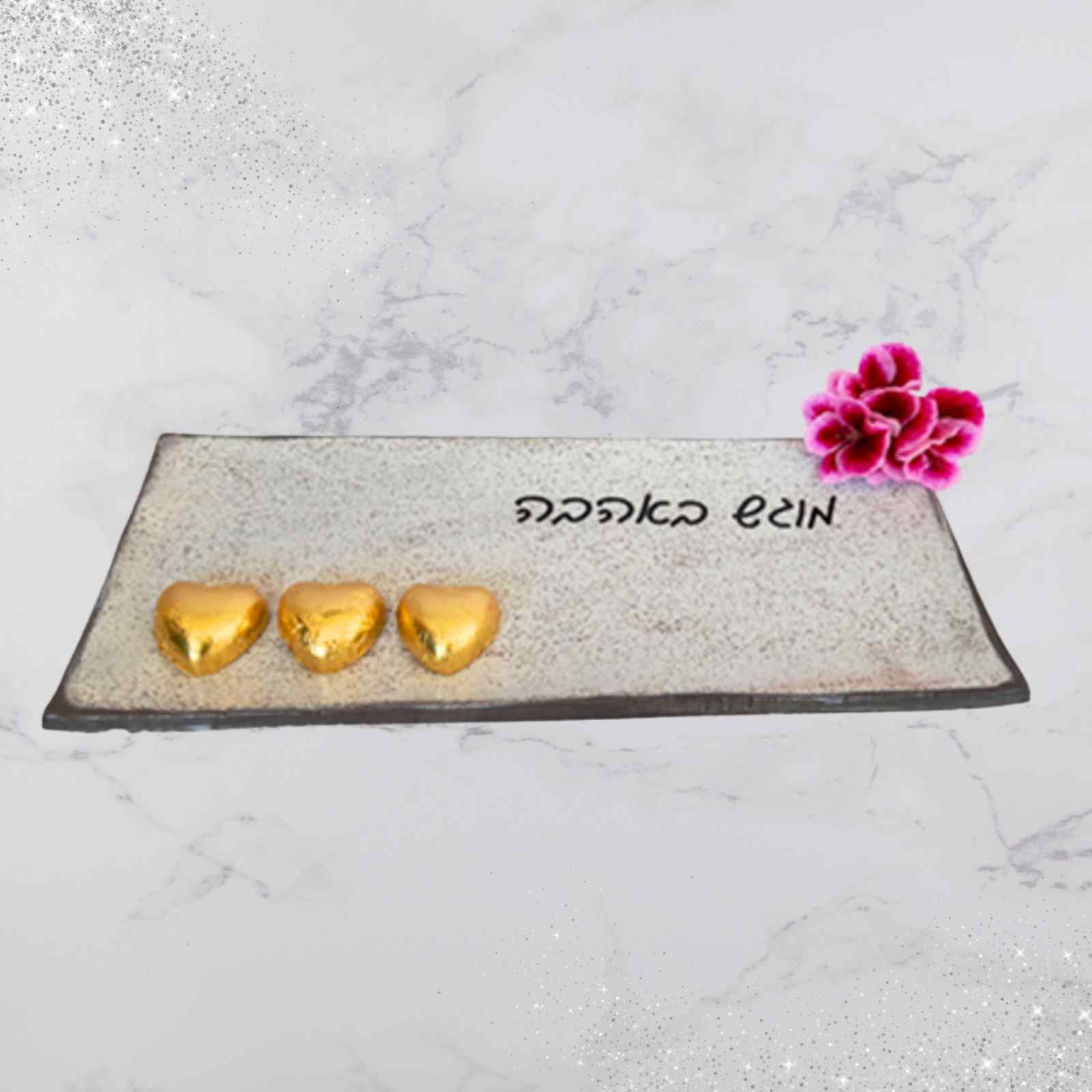 מגש מקרמיקה בעבודת יד עם כיתוב – מוגש באהבה גודל מגש 29/12 ס"מ